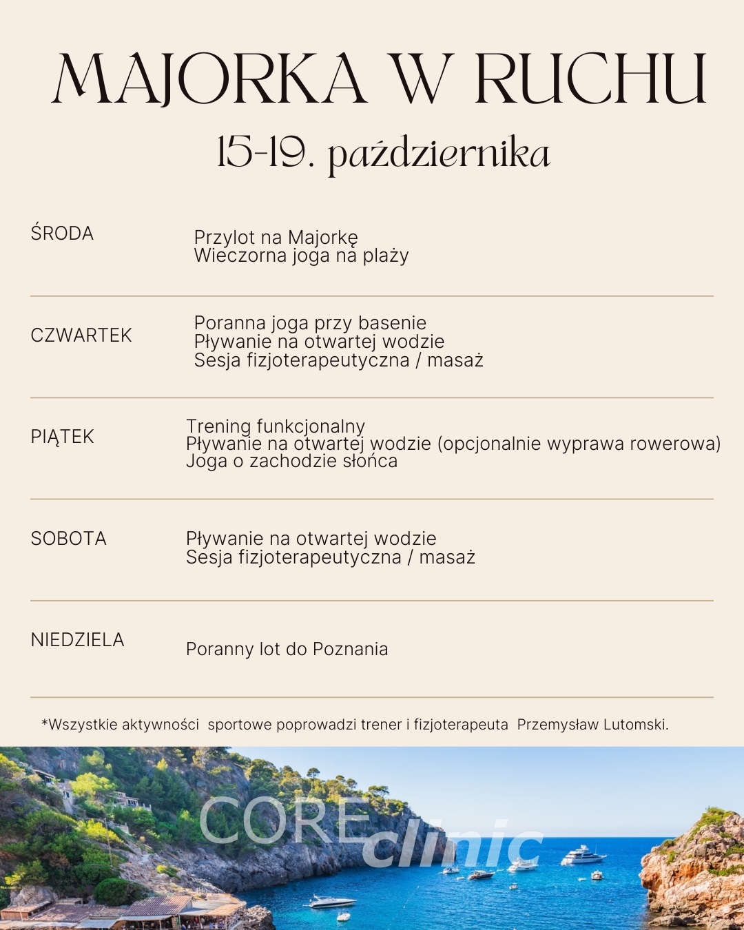 Z radością ogłaszamy wyjątkowy wyjazd, który połączy rekreację z regeneracją w przepięknej scenerii Majorki! Przygotowaliśmy dla Was program pełen aktywności, które zadbają o Wasze ciało i ducha.